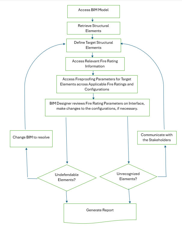 Access Revit Model: The workflow begins by accessing the digital representation of the building structure within the BIM platform Revit. This model serves as the primary data source for fireproofing analysis.