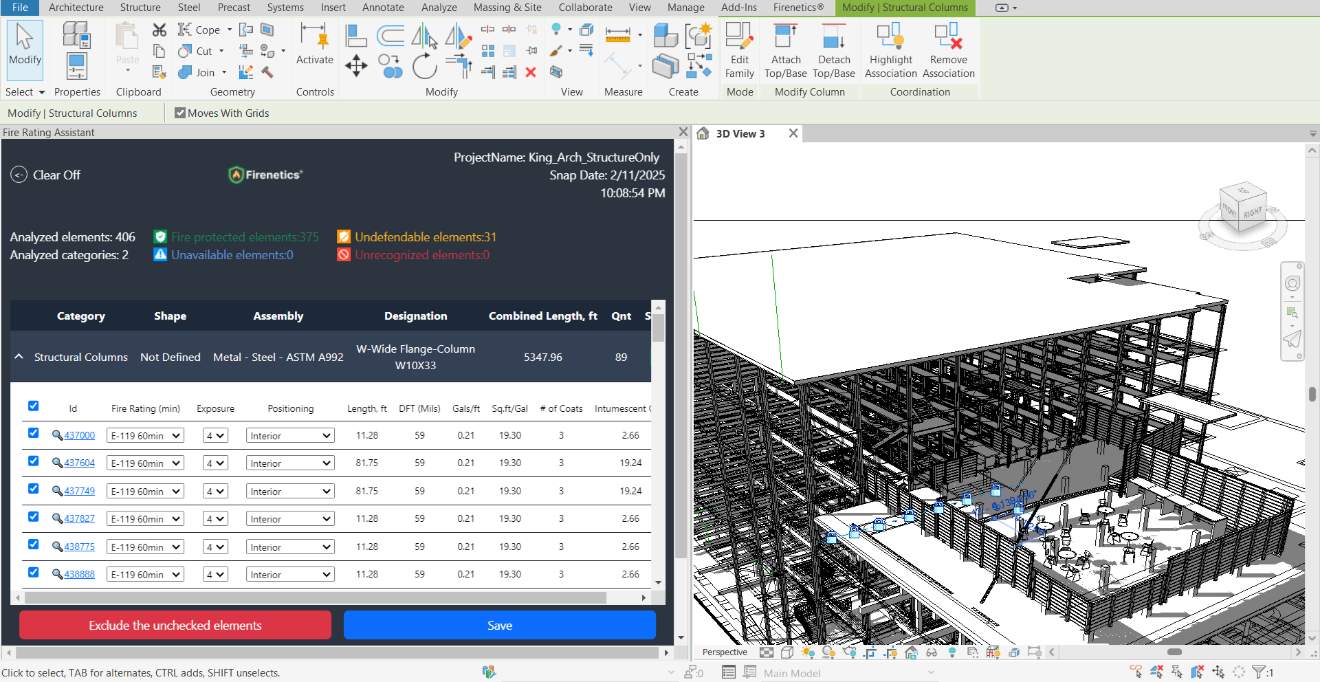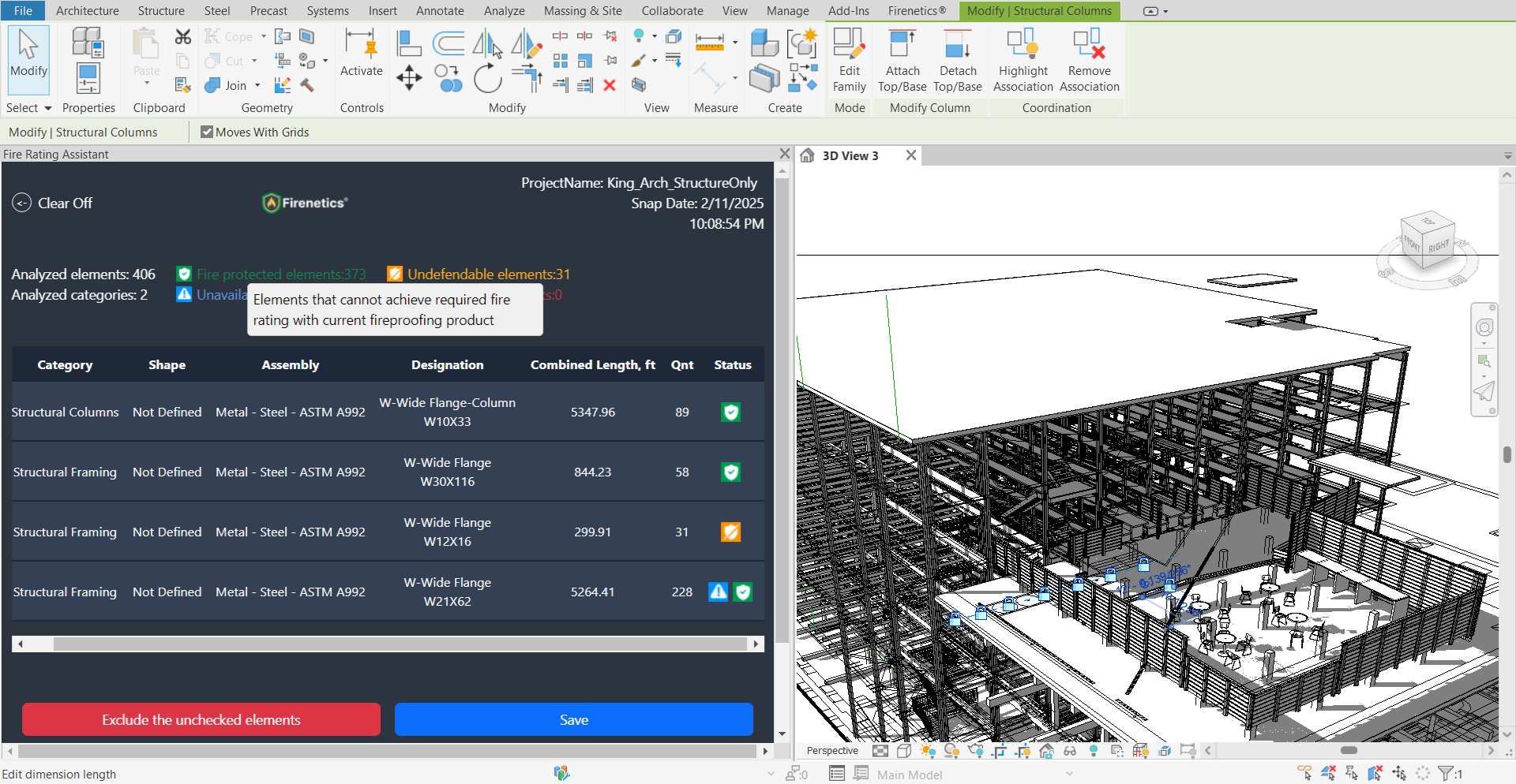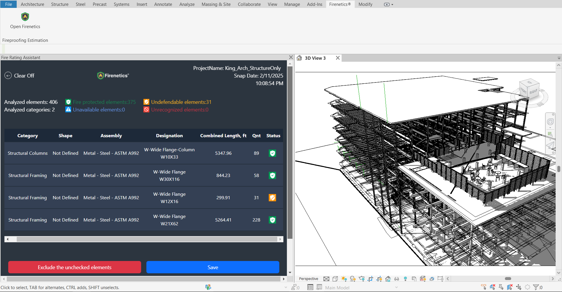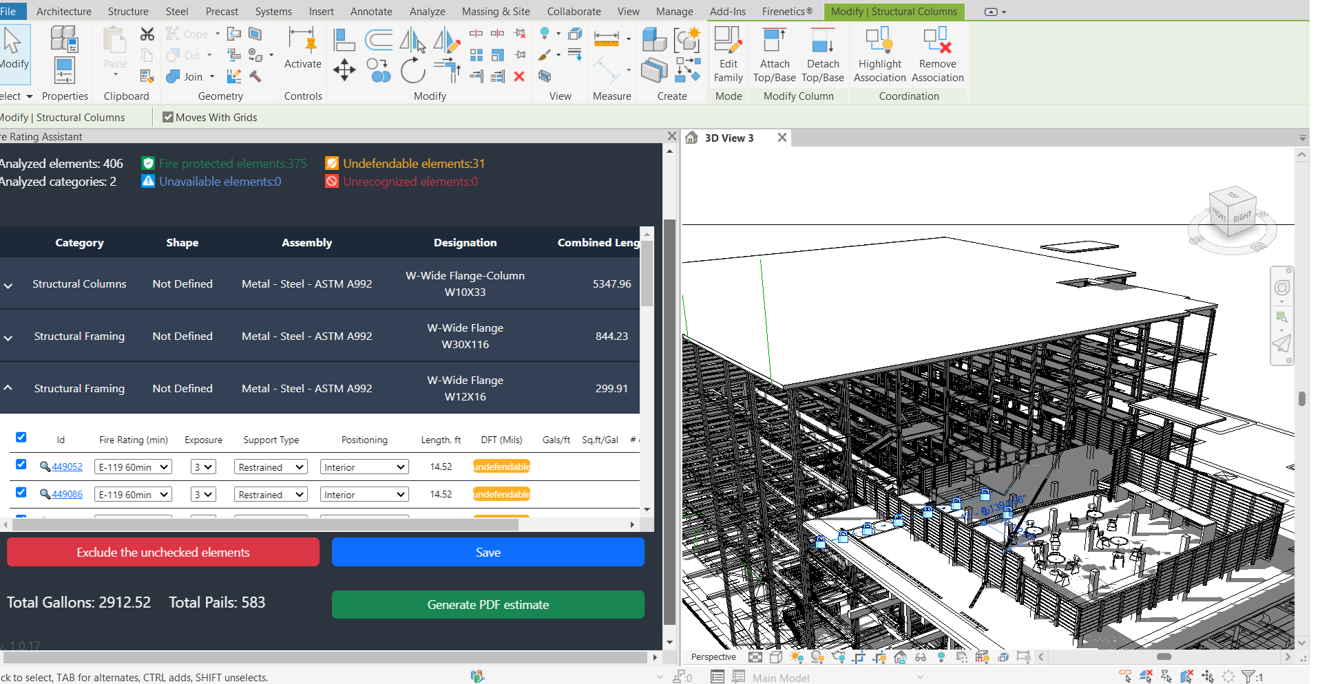 Firenetics® integrates fireproofing early in design. It estimates fireproofing needs, calculates key parameters, and flags elements that may not meet fire ratings.