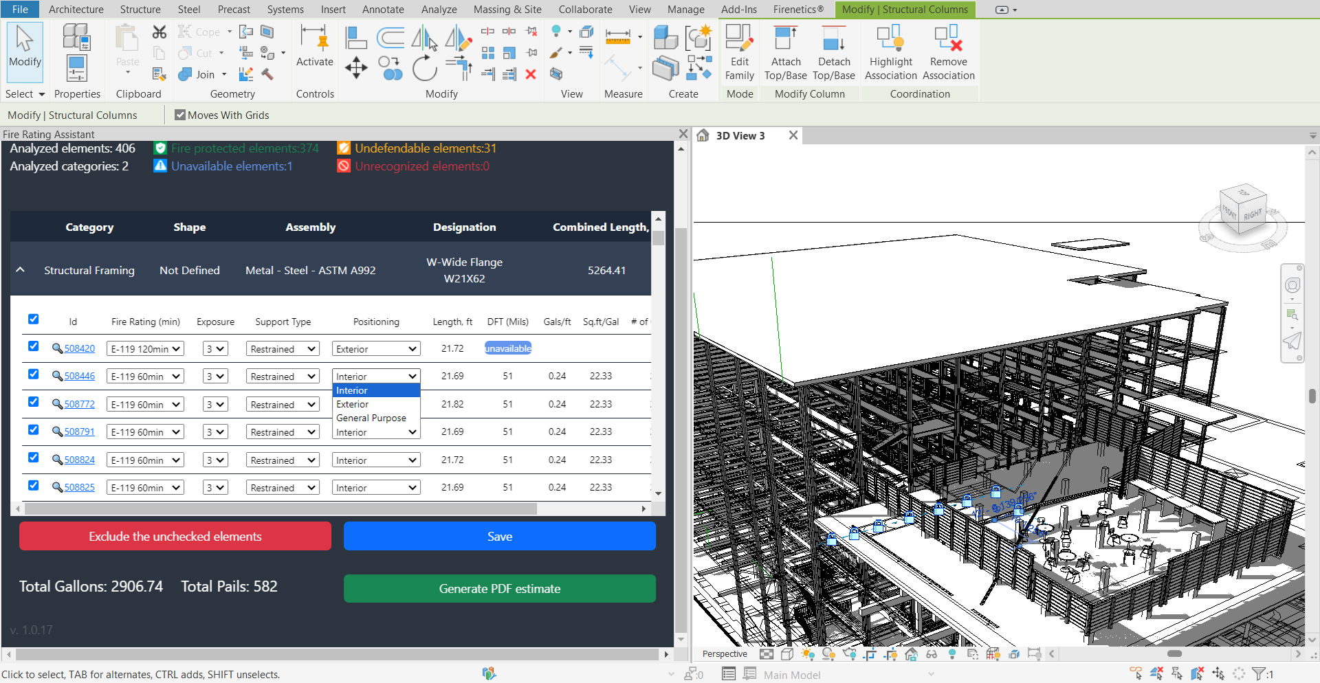BIM Designer Reviews Fire Rating Parameters on Interface: Designers interact with the FireNetics user interface to review and, if necessary, adjust the fireproofing configurations for the identified structural elements.